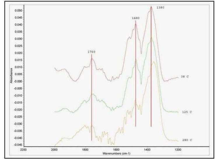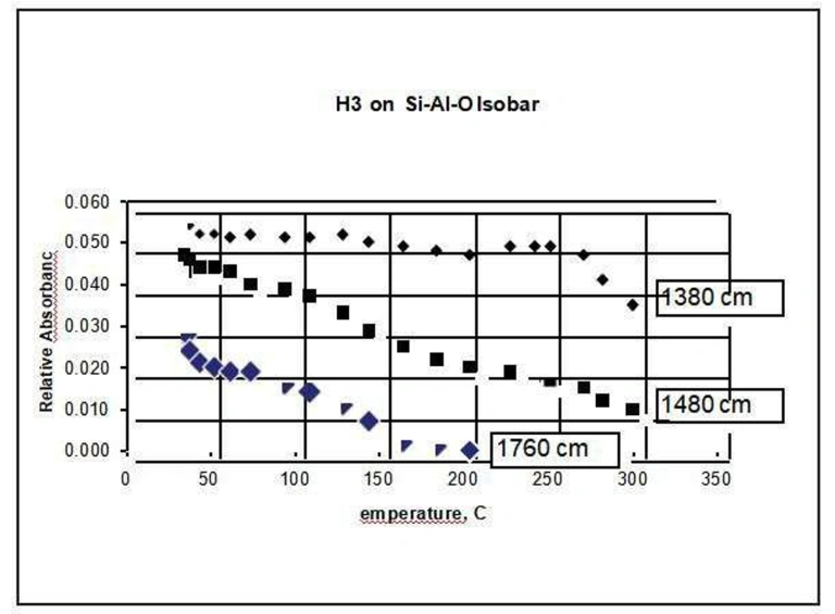 Ammonia can be used as a probe molecule to determine the magnitude and type of acid sites in a catalyst. Below, in figure 9, is an example of ammonia adsorbed on a silica-alumina material. Three broad bands were identified as belonging to the adsorbed ammonia, at approximately 1760, 1480, and 1380 cm-1. The band at 1480 cm-1 can be ascribed to ammonia adsorbed on Brønsted acid sites, the others to ammonia adsorbed on Lewis sites (see for example, M. Niwa et al., J. Phys. Chem. B, 110 (2006) p. 264). By carrying out temperature programmed experiments and following the absorbance of the three bands as a function of temperature, it is possible to measure the isobars for each type of adsorption and assess the strength of each adsorption process. These isobars are shown in figure 10.