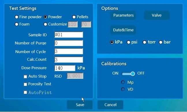 To enhance versatility, the software features five built-in test modes—Pellets, Powder, Fine Powder, Foam, and Custom—allowing for quick selection based on sample type.