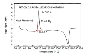 The crystal growth and degree of crystallization depend on the polymer type, cooling rate, or isothermal aging time. The calculation method for crystallization enthalpy is the same as that for melting enthalpy. Cold crystallization is the process of crystal growth during heating. This exothermic event precedes crystal melting.