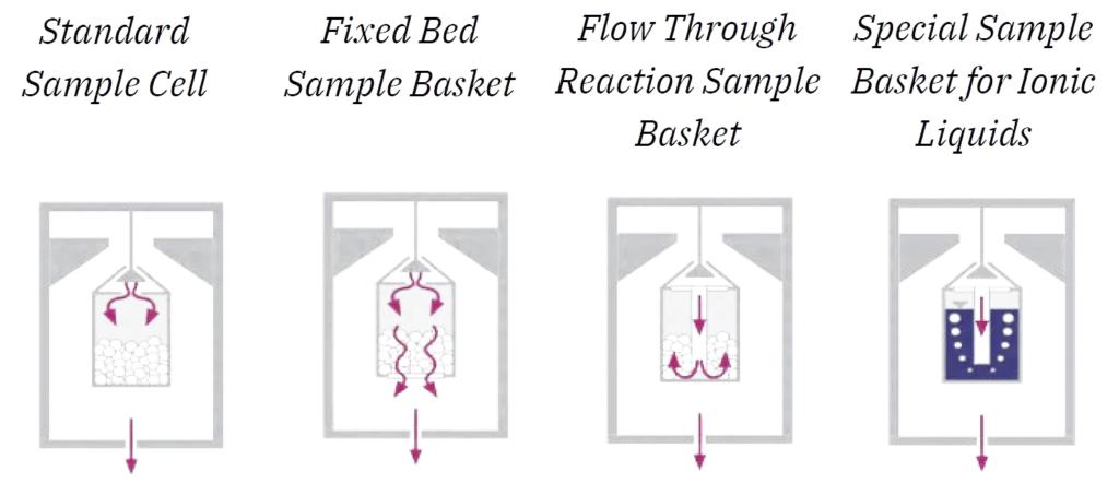 To simulate real-world reaction conditions, AMI offers a range of interchangeable measuring cells and sample basket modules. Sample cell dimensions—up to 70 mm in diameter—can be customized to suit various materials and experimental needs. AMI also provides tailored solutions, including the development of new basket designs based on customer requirements. Available options include FF-type fixed bed baskets, FT-type high-efficiency reaction baskets, and specialized baskets designed for ionic liquids.
