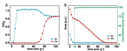 Figure 2 (A) Pore penetration experiment of Xe/Kr (20/80) mixture at 273 K and 1 bar conditions; (B) Desorption signals of Xe and Kr during regeneration process at 298 K with a flow rate of 3.5 mL/min-1 of N2, the green curve represents the real-time cumulative purity of Xe.