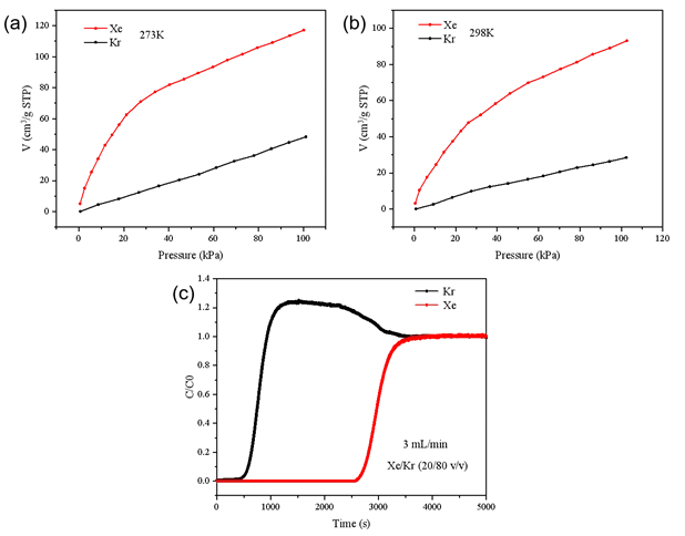 Figure 4 (a) Adsorption isotherms of Xe and Kr by MOF-4 at 273K; (b) Adsorption isotherms of Xe and Kr by MOF-4 at 298K; (c) Dynamic competitive adsorption curves of Xe/Kr by MOF-4 under normal temperature and pressure, total flow rate of 3 mL/min (Xe/Kr 20/80)
